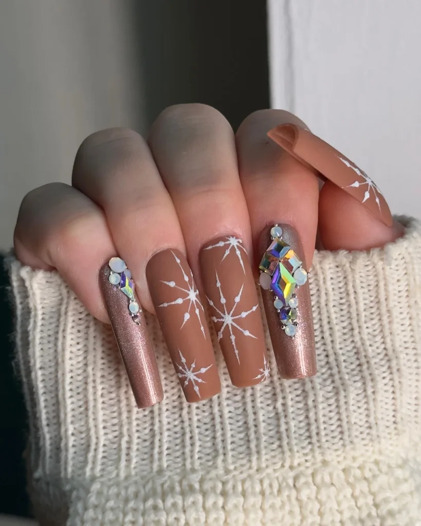 Long coffin-shaped nails are painted in matte brown with bold white snowflake art. Glittering rose-gold accents and sparkling rhinestones add dimension, creating a luxe winter vibe. The matte base makes the snowflakes stand out, while the gems bring dazzling contrast.