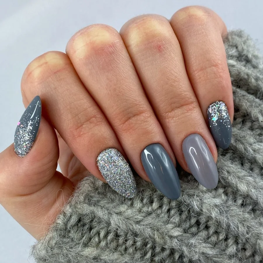 A mix of grey shades is paired with sparkling silver glitter accents, creating a modern and festive winter look. The almond shape enhances the elegance, while the glitter adds eye-catching detail. This design feels cozy with the muted grey tones but still festive thanks to the shimmer.