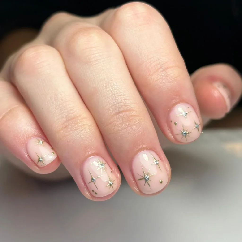 Delicate nude nails are decorated with tiny golden starbursts and dots, giving a celestial charm to a simple base. Each fingertip shines with a soft glow, reminiscent of the clear winter night sky. This minimalist yet eye-catching design offers a dreamy touch while staying chic and versatile.