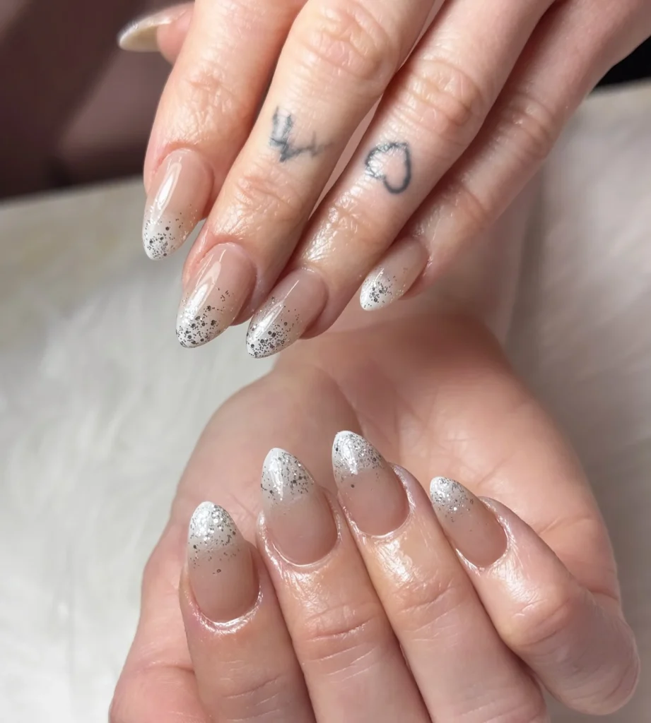 Soft nude nails fade seamlessly into silver glitter tips, creating a graceful ombre effect. The almond shape enhances the delicate design, adding a touch of elegance to the sparkling gradient. This style feels timeless, capturing the beauty of frosted windows and snowy evenings.