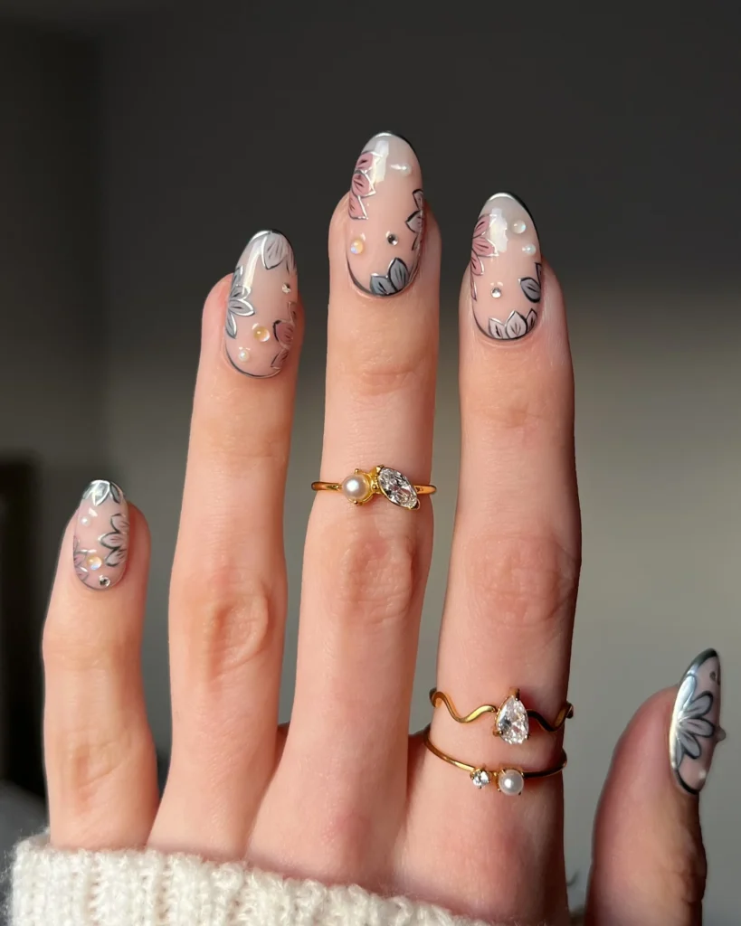 Nude nails are adorned with delicate floral outlines in muted tones, paired with pearl-like accents and subtle crystals. The floral art feels soft and artistic, while the jewels add a hint of glamour. This design has a cozy sophistication, making it ideal for winter when soft details feel extra inviting.