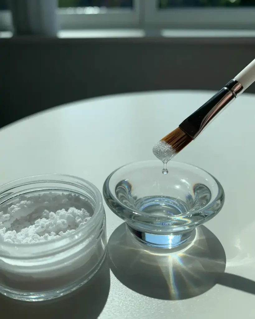 Acrylic nails use a liquid (monomer) + a powder (polymer) that combine into a workable bead. You place that bead on your nail, shape it, and let it harden into a strong layer.
