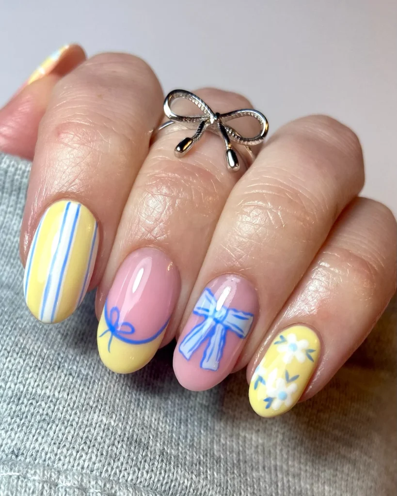 There is something so sweet about this blue and yellow nail look. The tiny bows and daisies feel like wrapping sunshine in ribbons. It reminds me of spring mornings when everything feels soft and new. Each detail adds a touch of innocence that still feels polished.
