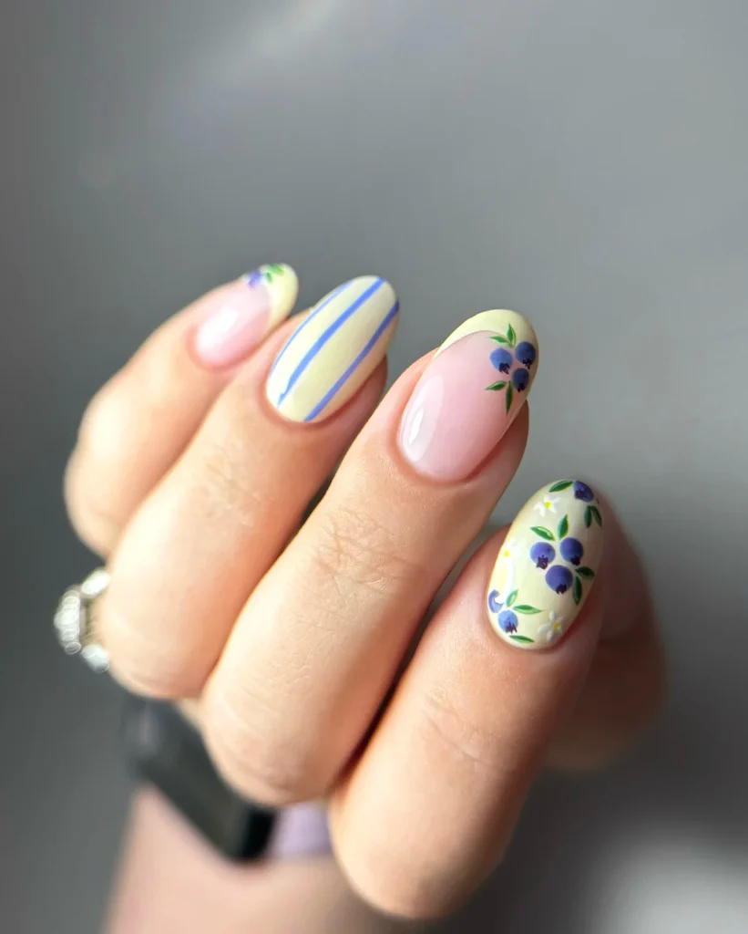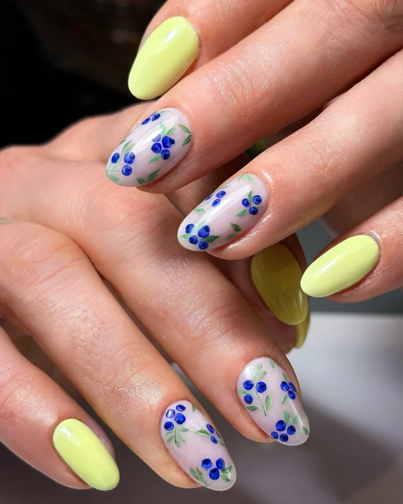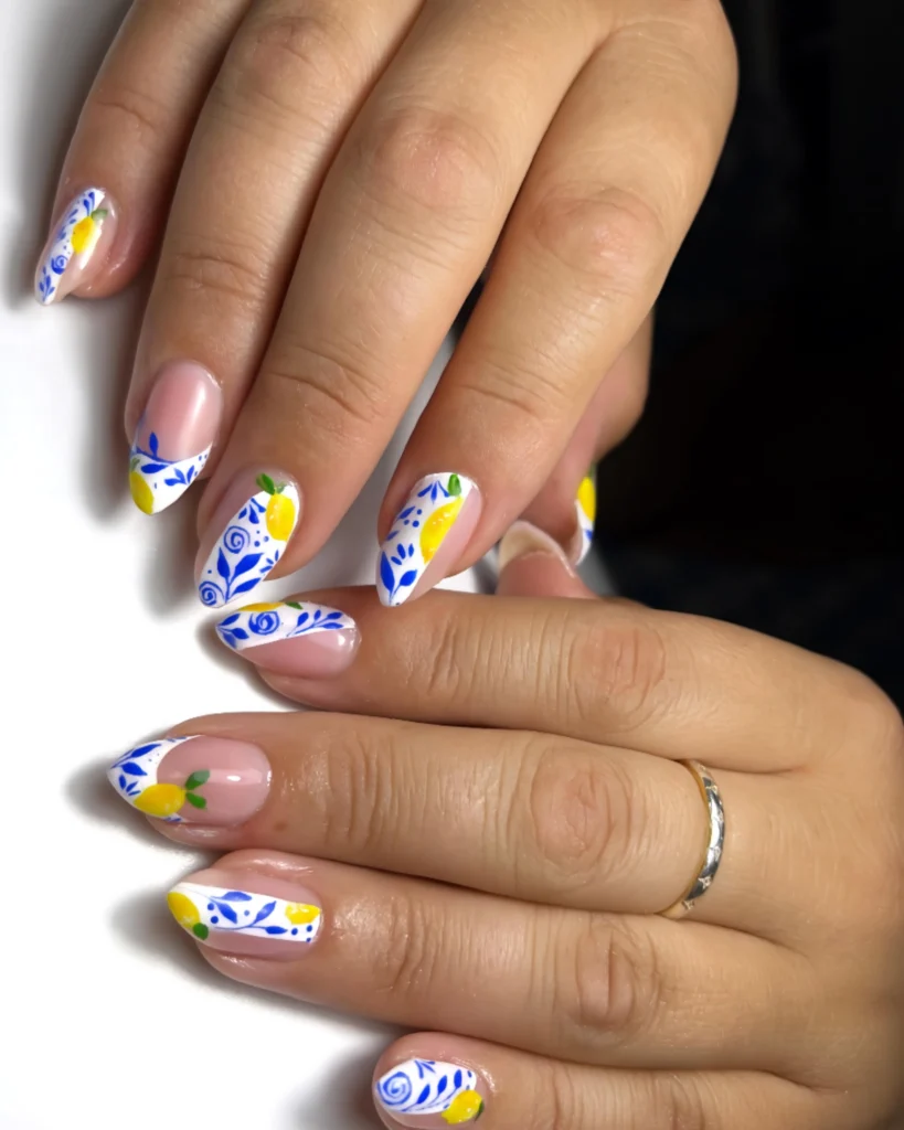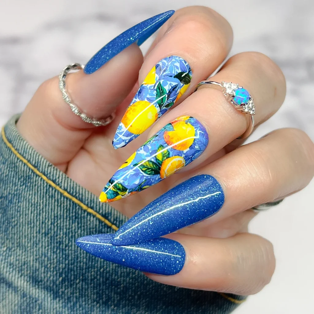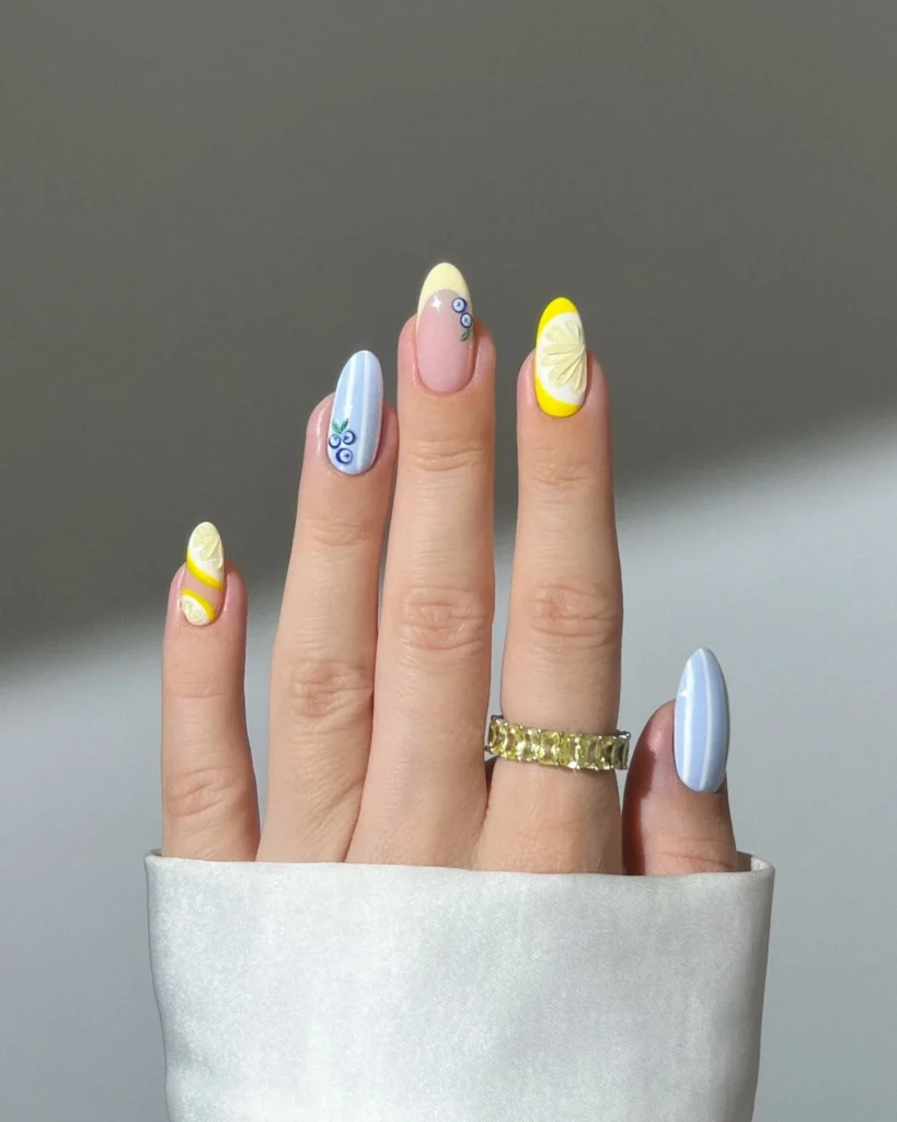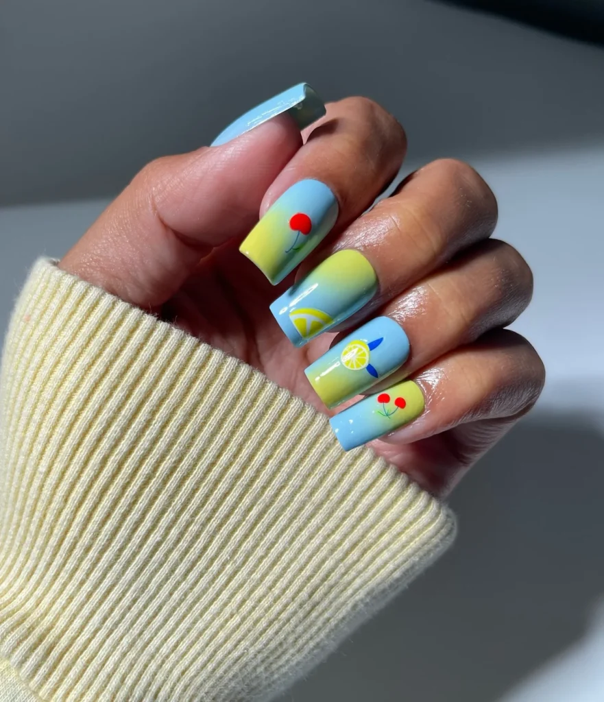 These nails look like summer bottled up. The soft blue and citrus yellow make the perfect pair. The tiny fruit details are adorable and make me think of lemonade stands and sunny patios. It is bright clean and full of happy energy.