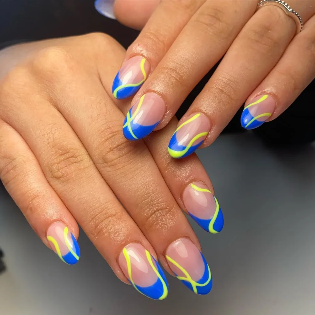 This blue and yellow French nail art feels so fresh. The wavy lines make it modern and effortless. It is the kind of design that looks simple but still gets compliments. Every curve adds a little rhythm and flow.