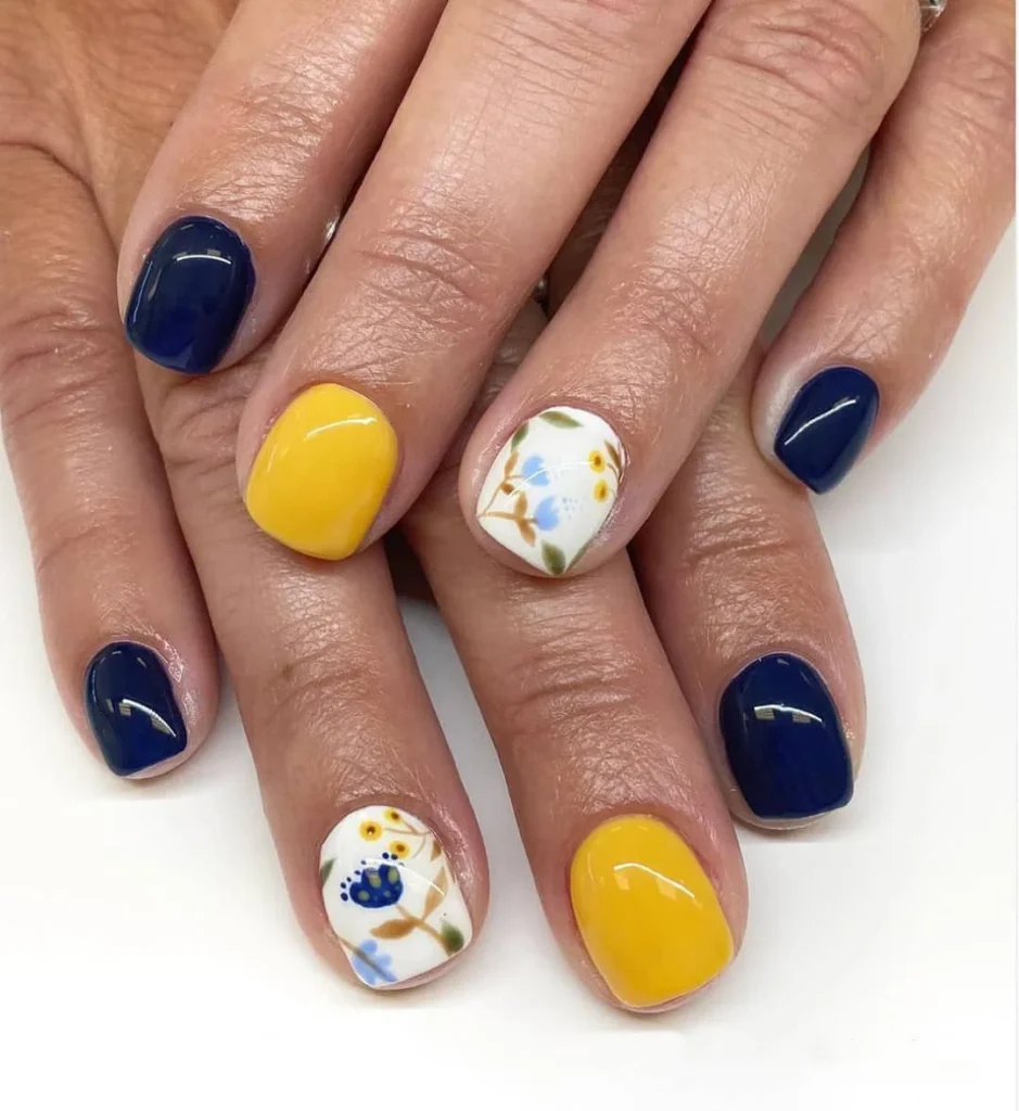 This nail design feels sophisticated and timeless. The mix of navy blue and mustard yellow gives a classic fashion vibe. The floral accent nail ties it all together with elegance. It feels like a cozy yet bold choice.