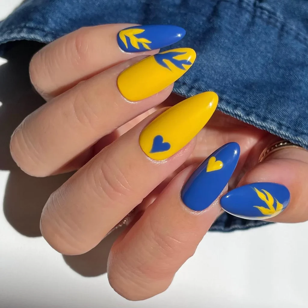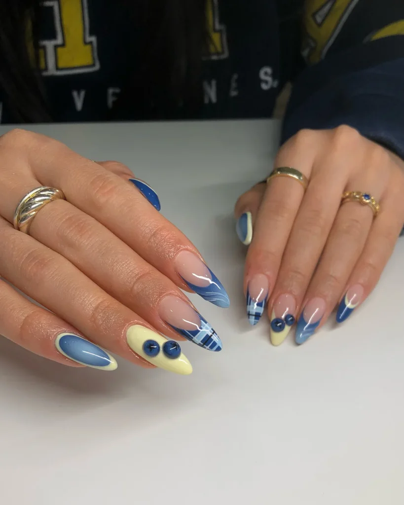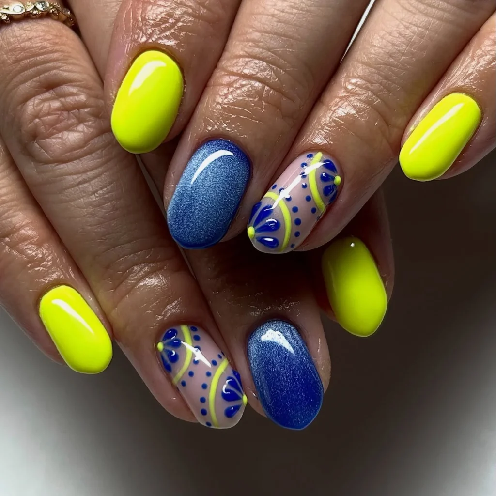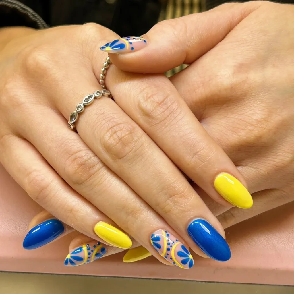 Blue and yellow nails have a way of turning any day into a good one. The calm of blue meets the joy of yellow and suddenly everything feels brighter. It is confident playful and just the right mix of bold and beautiful.