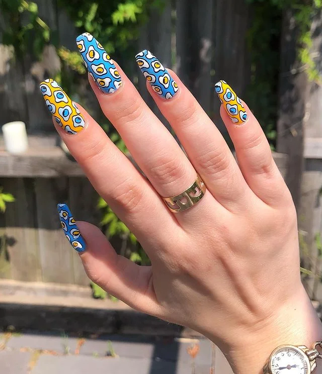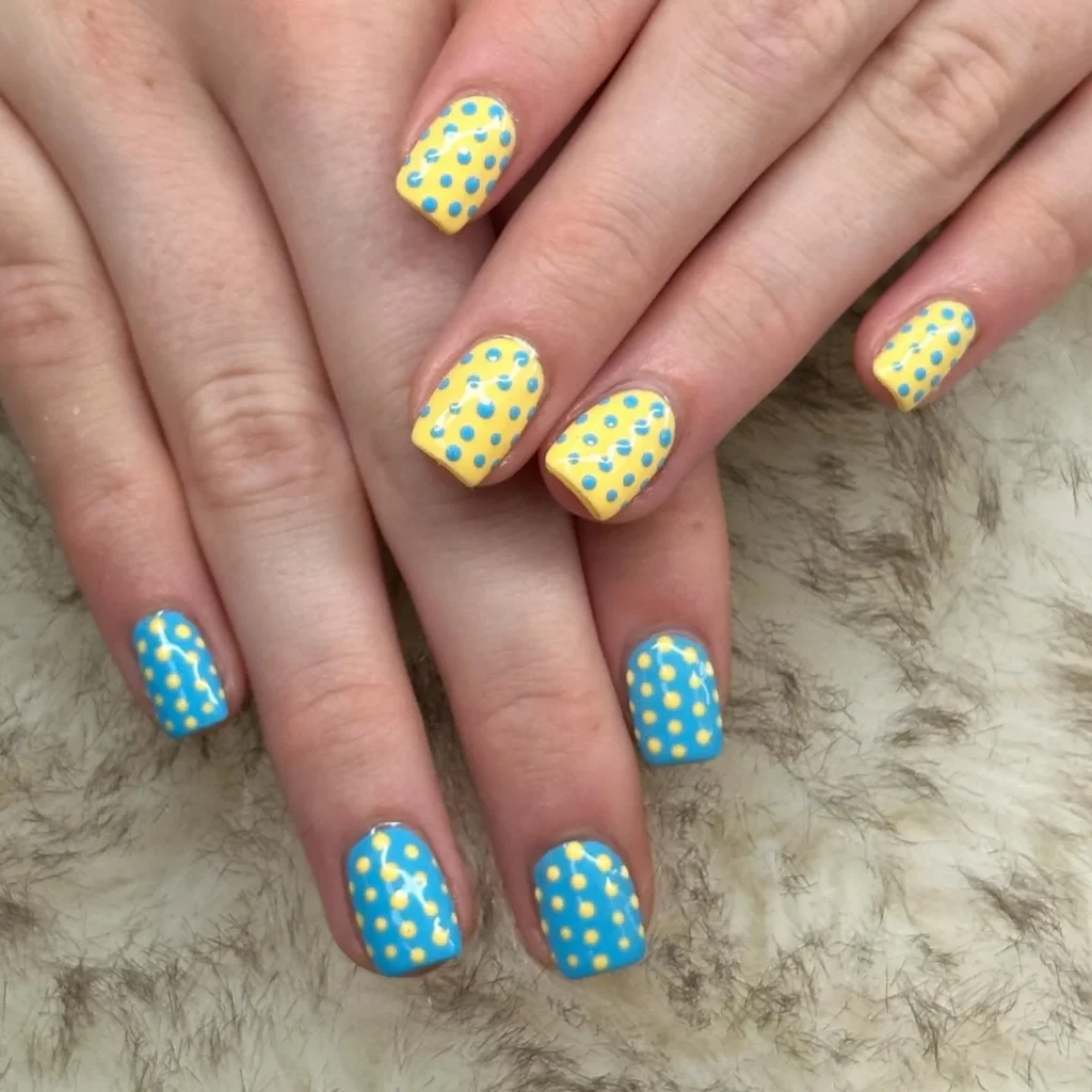 These nails are pure joy. The mix of blue and yellow dots feels fun and carefree like sunshine on a weekend. Every nail feels different yet perfectly coordinated. It is a playful design that adds instant charm to any outfit.