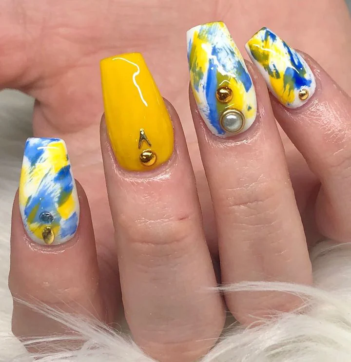 These nails look like wearable art. The mix of marble blues and yellows feels abstract and rich. The tiny gold studs take it from fun to luxurious. It is the kind of look that makes your hands feel like jewelry.