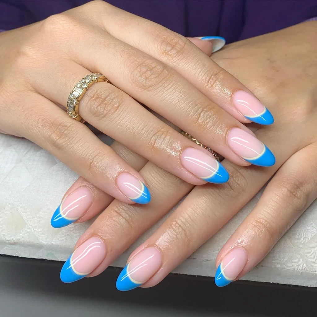 These nails are clean modern and a little bit cheeky. The pop of blue along the tips looks effortless but still turns heads. I love how the lines are sleek and balanced. It is the kind of design that makes you feel like you have it all together even on messy days.