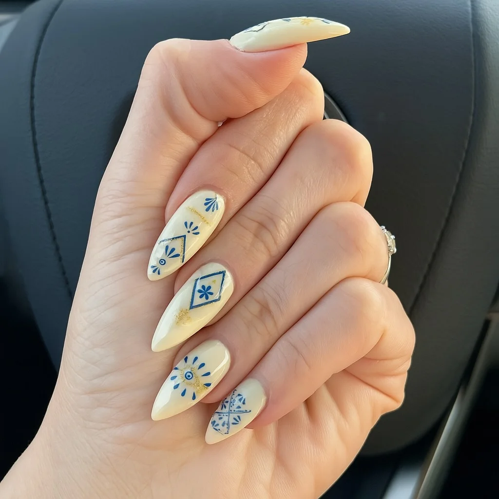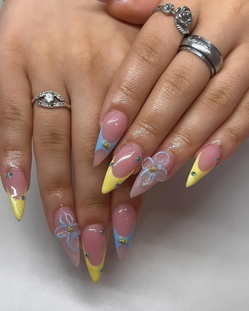 These nails remind me of lemon sorbet and sky blue ribbons. The sculpted petals and gold beads add a gentle touch of luxury. The shape feels sharp yet elegant. It is the kind of nail art that makes you feel like you belong in a dream garden.