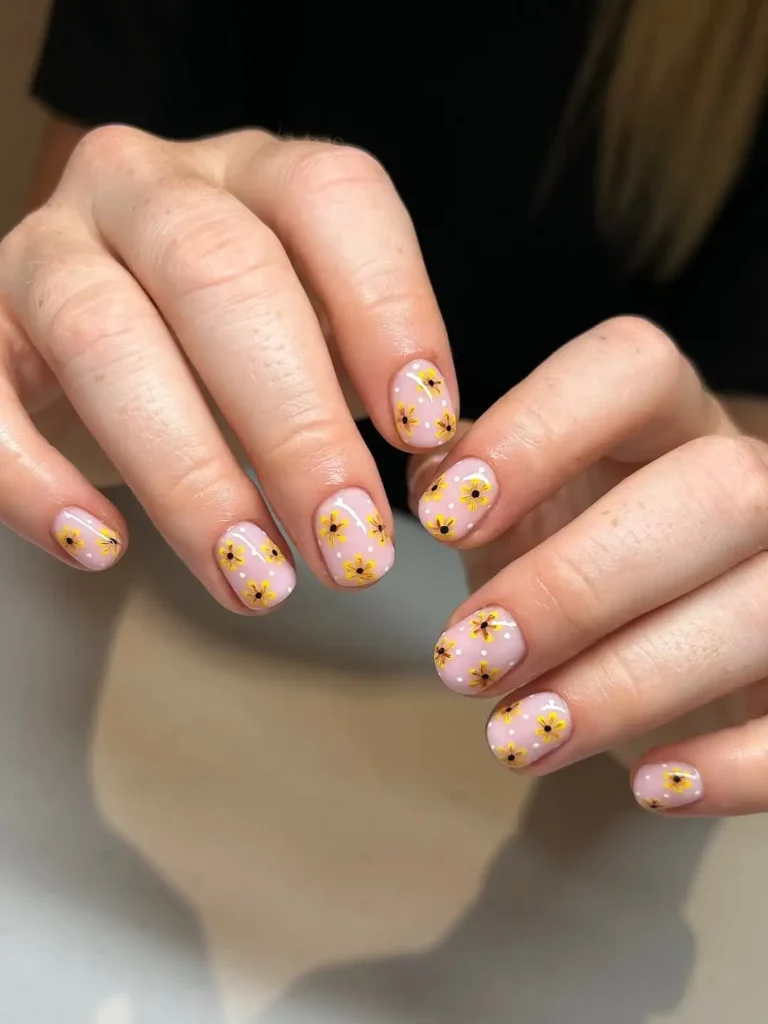 I really notice how delicate this sheer pink base looks against the tiny yellow flowers. The short length makes the details feel even more noticeable, and the small white dots add a soft texture without cluttering the design. The gloss gives it a clean surface, while the floral pattern keeps it from feeling plain.