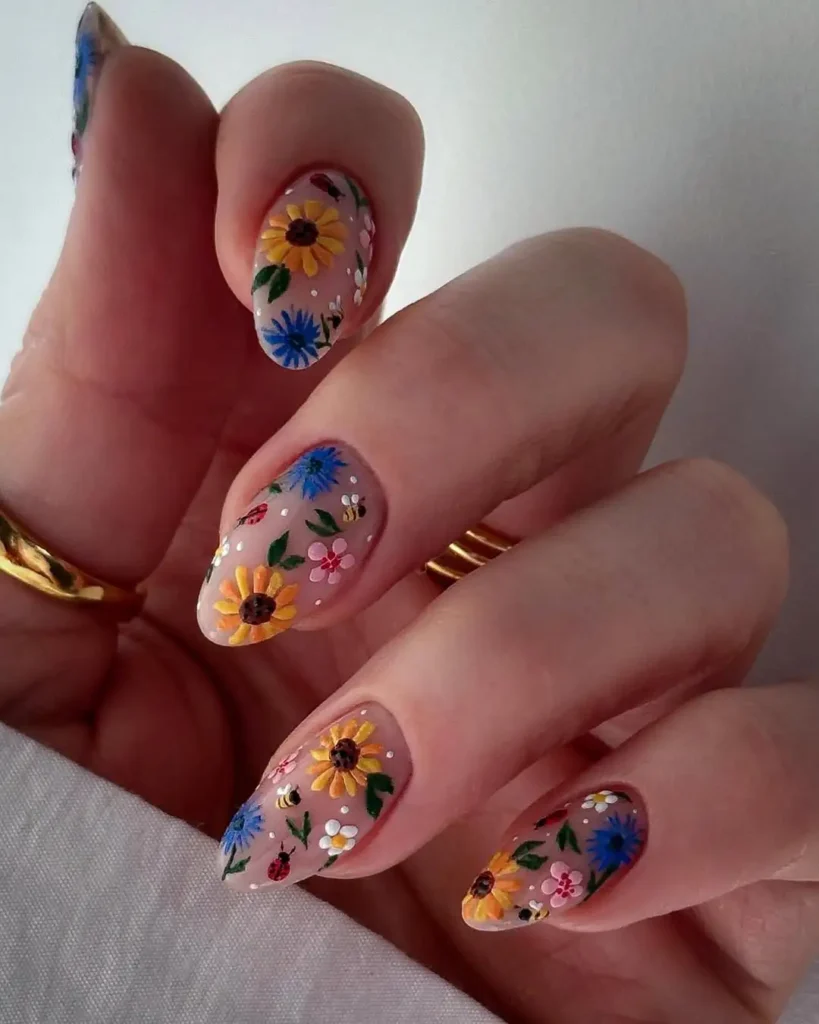 I can’t stop looking at the amount of detail packed into this short, rounded shape. The mix of yellow sunflowers, blue blooms, and tiny bees over a sheer base feels layered and lively. The glossy topcoat pulls all the colors together, and the natural base keeps it from looking too heavy.
