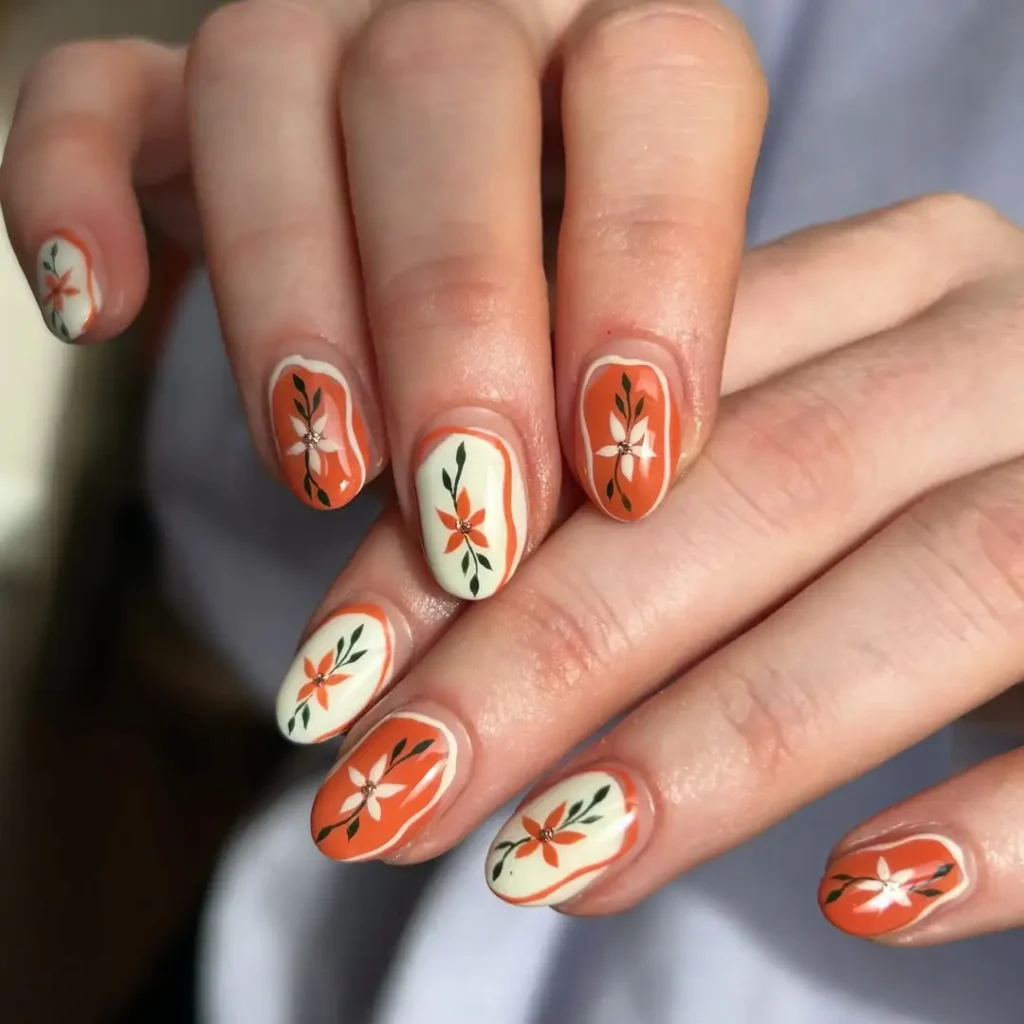 #15. Orange and Cream Floral Contrast Nails