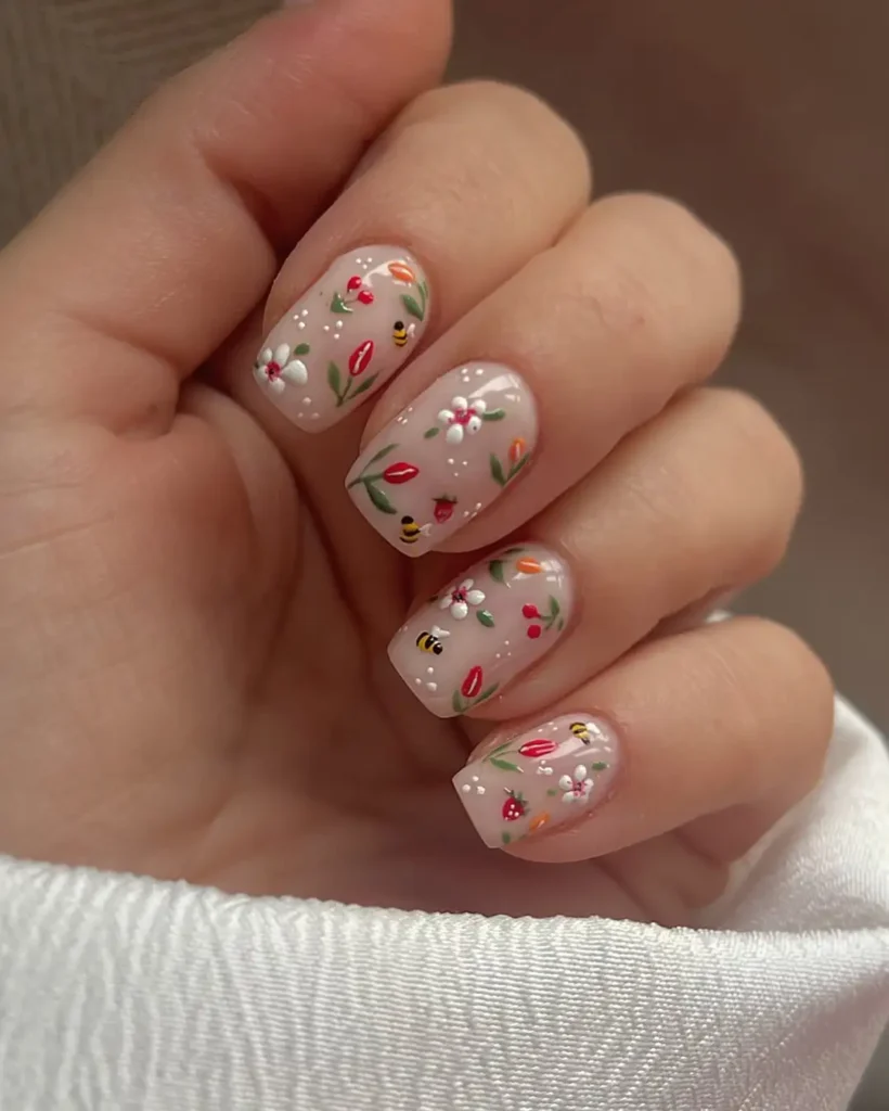 What catches my attention first is the slightly sheer pink base that lets a hint of natural nail show through. The tiny flowers and small bee details feel playful but still subtle because of the muted background. I notice how the square short shape keeps the design grounded, even with the scattered art across each nail.