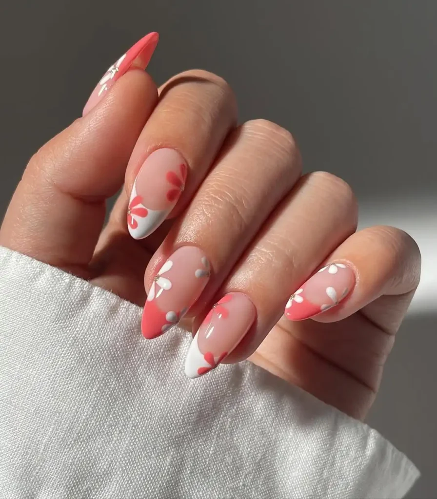 #6. Coral and White Floral Almond Nails