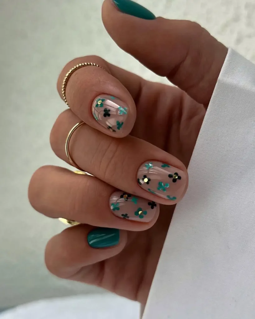 The deep emerald thumb contrasts nicely with the sheer floral nails, and I like how the darker green anchors the lighter designs. The short rounded shape keeps the look practical while still feeling styled. I notice the small metallic accents catching light subtly without overpowering the rest.