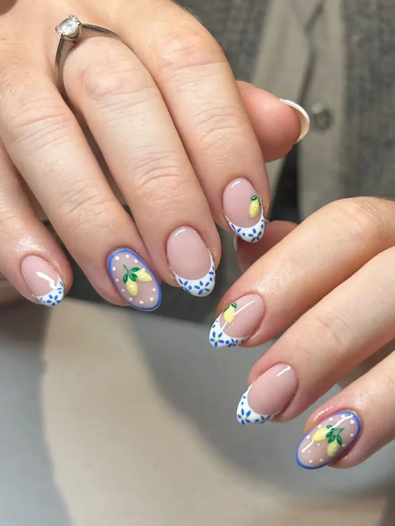 I find myself looking at the lemon details more than I expected. The blue French tips frame the short almond shape neatly, and the white dot accents give a soft texture across the nude base. The combination of bright yellow and cool blue feels lively without looking chaotic. The glossy finish ties everything together smoothly.