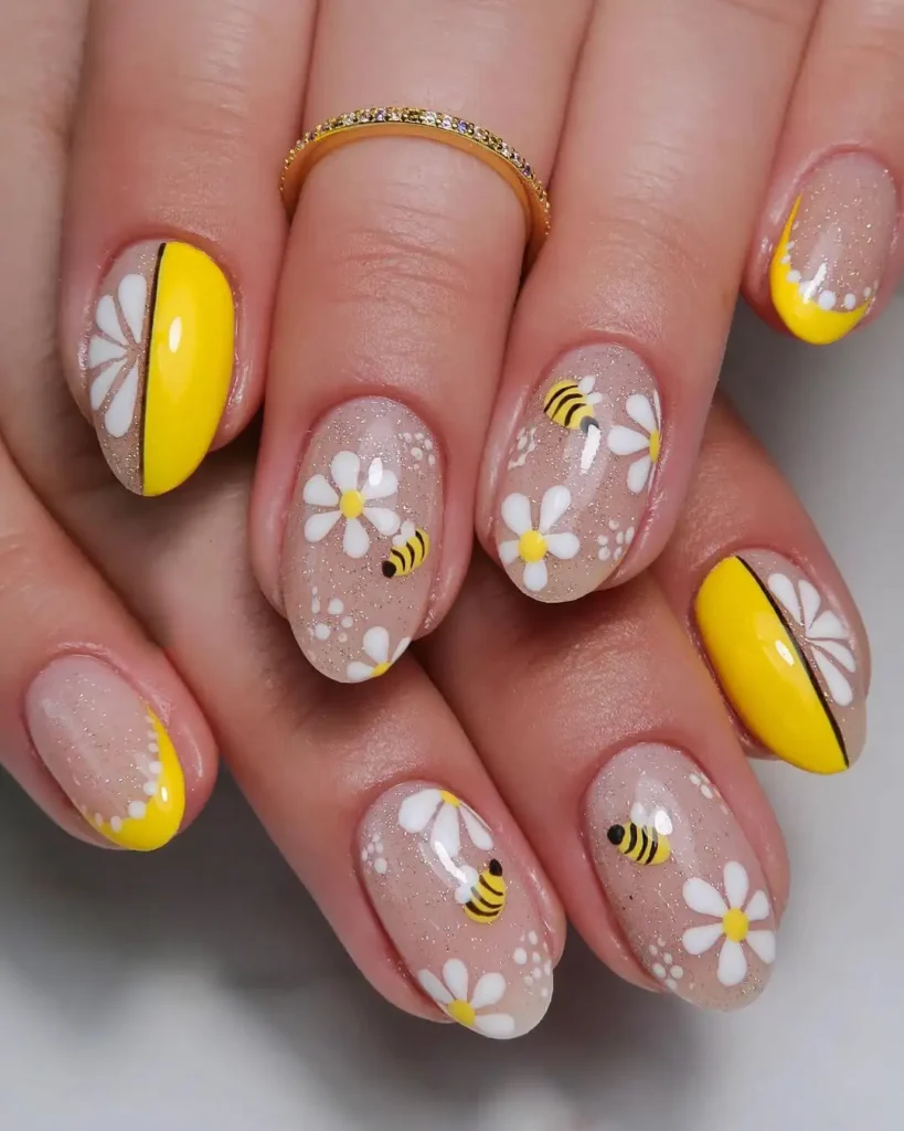 I notice how lively this set feels without being overwhelming. The soft glittery nude base keeps everything light, while the bright yellow panels and tiny bee details add personality. The rounded almond shape softens the bold color, and I like how the white daisies break up the yellow so it doesn’t feel too solid.