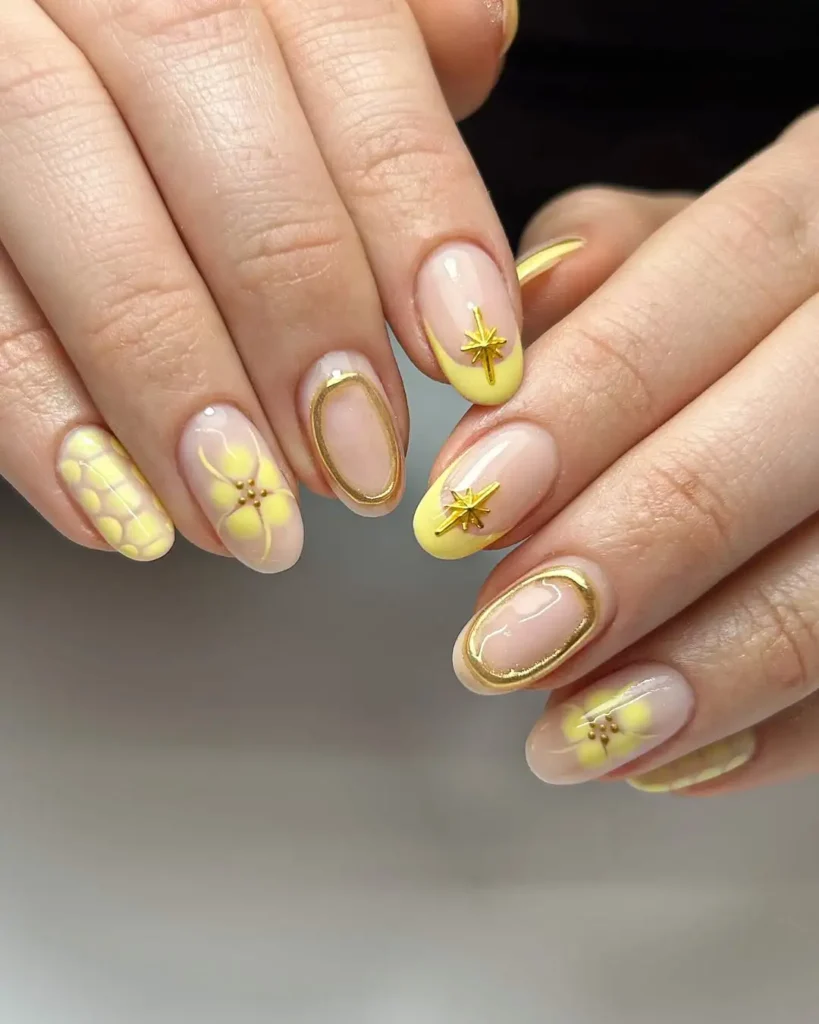 The gold outlining and star details make this design feel slightly more structured. I’m drawn to how the yellow is paired with nude, allowing the metallic accents to stand out. The rounded almond shape keeps it soft, while the glossy top coat makes the gold elements reflect light more noticeably.