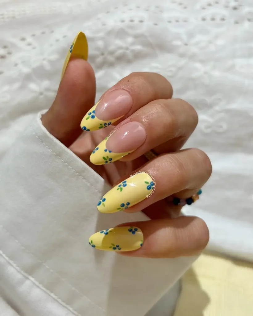 This almond-shaped set mixes soft yellow with delicate blue floral accents along the tips. The sheer pink base keeps it balanced, giving the design a light, fresh feel that works beautifully for sunny days.