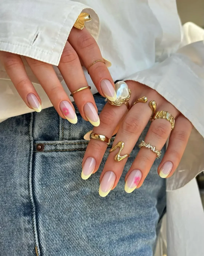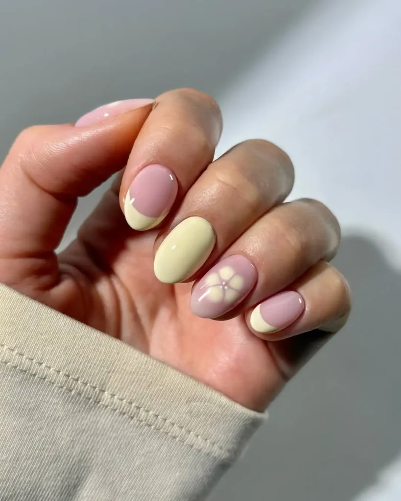 This one feels much calmer to me. The mix of creamy yellow and blush pink creates a gentle contrast that doesn’t compete for attention. I’m drawn to the subtle flower on the accent nail because it blends into the base instead of sitting heavily on top.