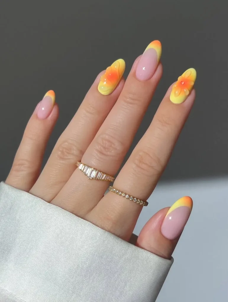 Bright yellow and warm orange tones blend together in a soft ombré, topped with raised floral details. It’s cheerful and bold without being overwhelming, capturing that late-afternoon sunshine mood in the prettiest way.
