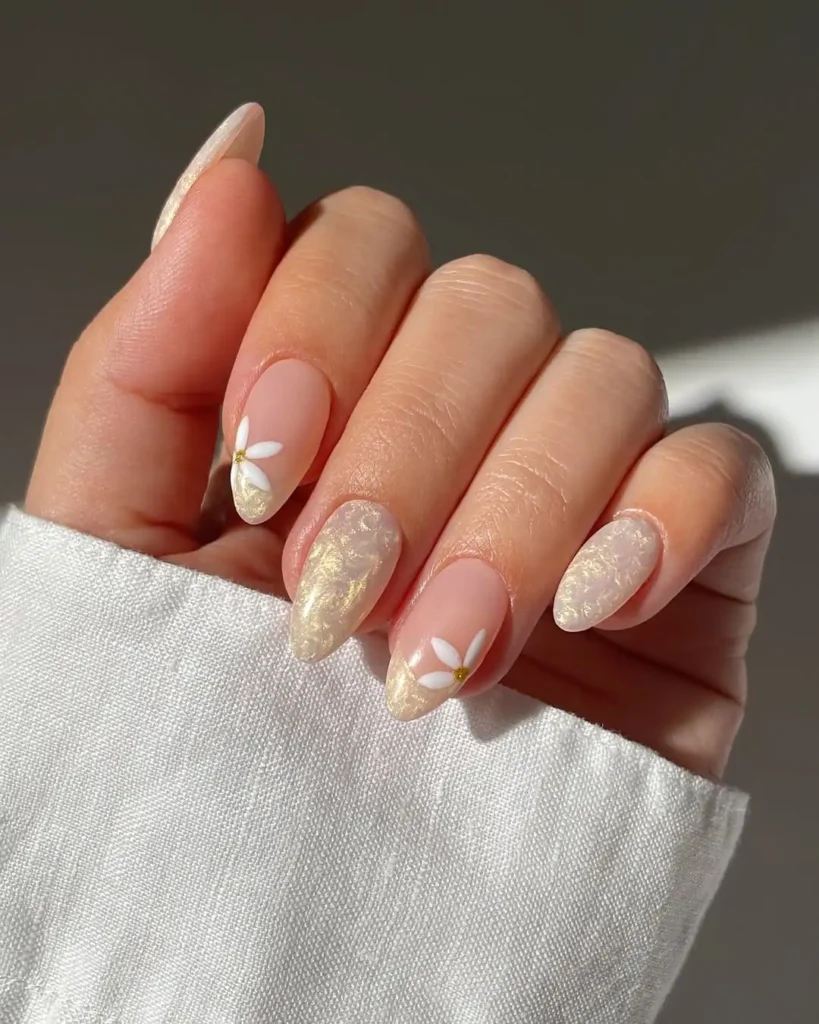 This set feels cozy to me, especially with the soft cream polish paired with sheer pink and tiny floral accents. The mix of solid and floral nails gives it depth without looking busy. I notice how the almond shape adds length while the light tones keep it gentle.