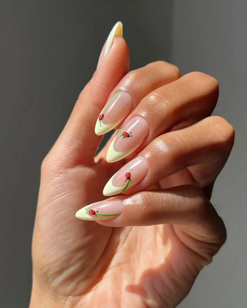 The tiny red ladybugs catch my eye immediately. Against the pale yellow French tips, they feel playful without being loud. I like how the nude base keeps the look clean, and the slim almond shape adds balance. The glossy finish makes the red details stand out more than I expected.