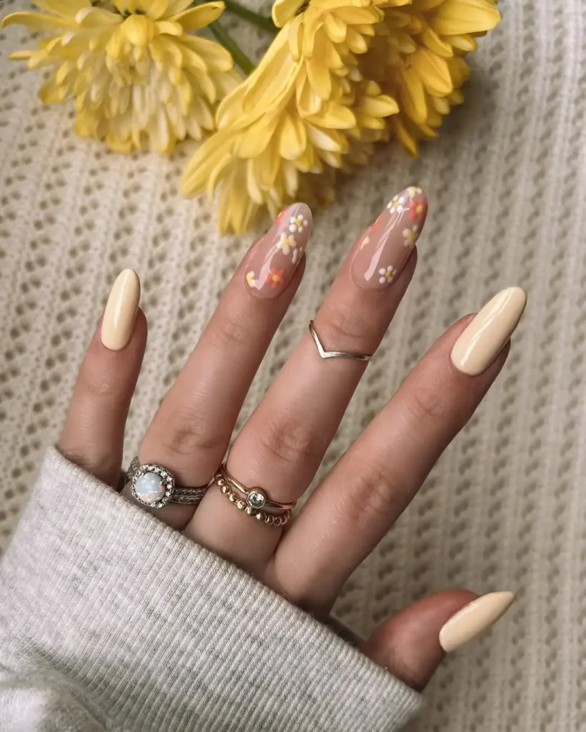 This design feels slightly bolder because the yellow is more saturated. I’m drawn to how the white daisies contrast sharply against the nude base, making them pop without looking heavy. The almond shape keeps it elegant, and the clean French line adds structure to the playful florals.